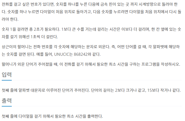 첫째 줄에 알파벳 대문자로 이루어진 단어가 주어진다. 단어의 길이는 2보다 크거나 같고, 15보다 작거나 같다.