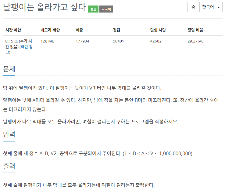 첫째 줄에 세 정수 A, B, V가 공백으로 구분되어서 주어진다. (1 ≤ B < A ≤ V ≤ 1,000,000,000)