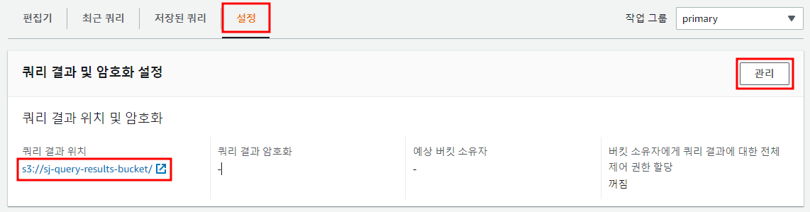 - 버킷을 생성한 후 Athena 콘솔로 돌아가서 콘솔 왼쪽 상단의 설정 클릭 후 관리 클릭