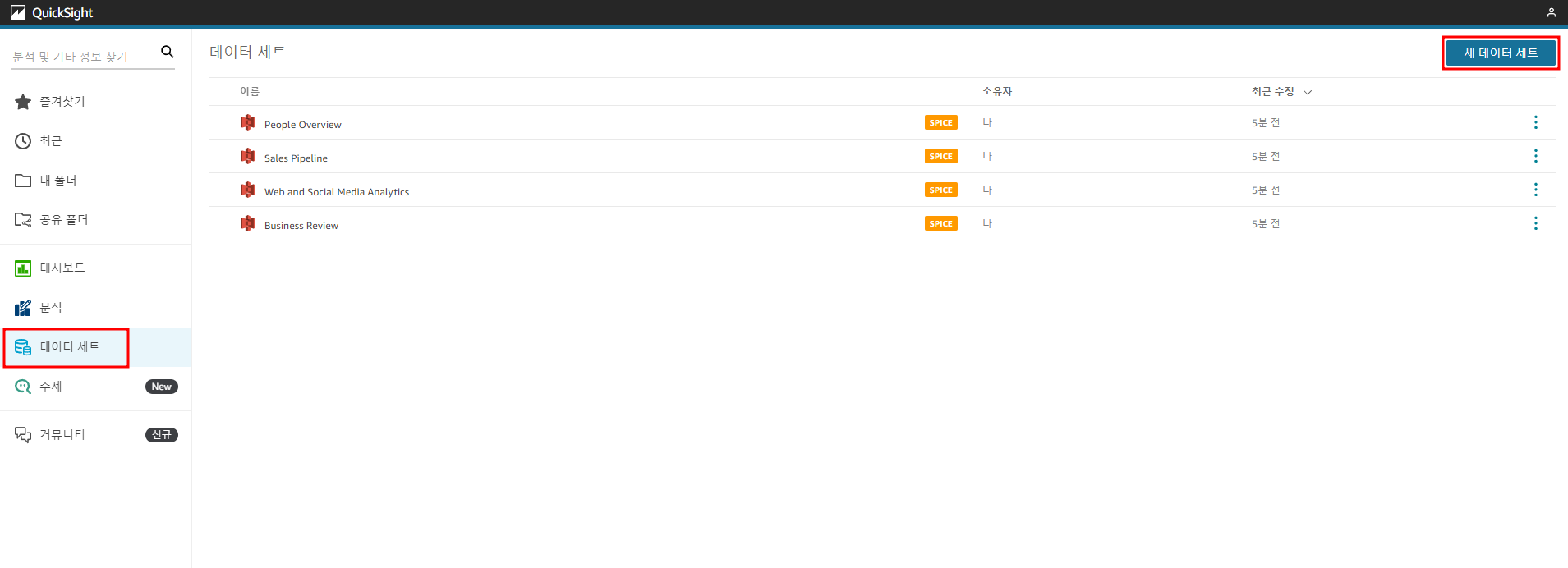 데이터 세트를 클릭하여 우측 상단의 새 데이터 세트를 클릭해준다. .