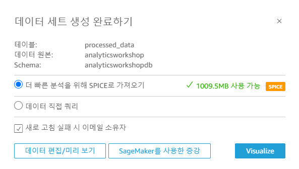 SPICE for quicker analytics를 선택하여 프로세싱한다. (시각화에 걸리는 시간을 줄여주는 AWS 인메모리 엔진)