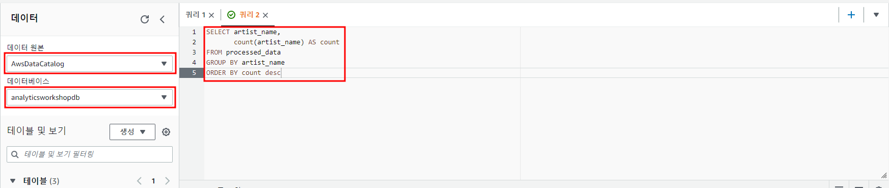 데이터 원본 : AwsDataCatalog를 선택하여 AWS Glue 카탈로그에 접근