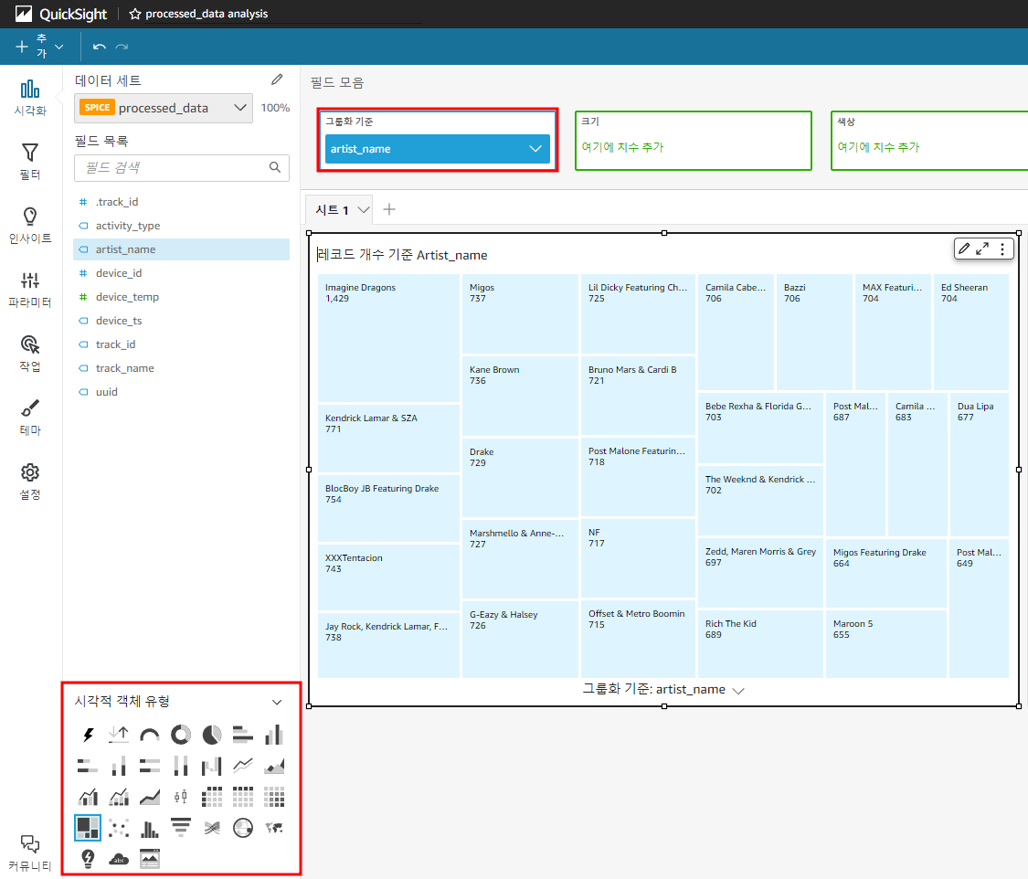 위와 같은 설정을 통해 '가장 많이 연주된 아티스트'를 시각화한다.