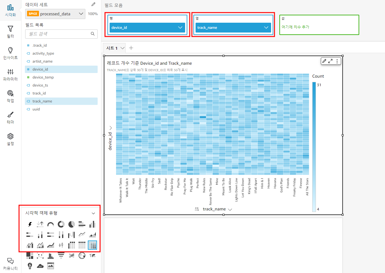 위와 같은 설정을 통해 '어떤 사용자가 반복적으로 트랙을 듣고 있는지'를 시각화한다.
