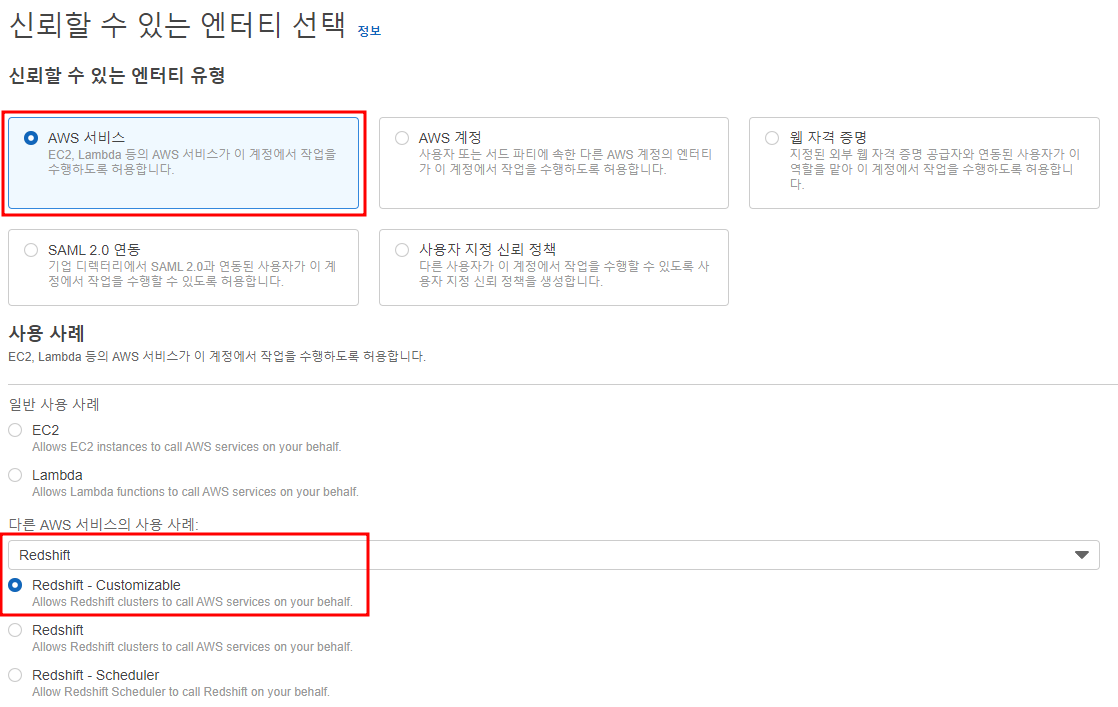 이 단계에서는 Redshift 클러스터를 위한 IAM 역할을 생성한다.