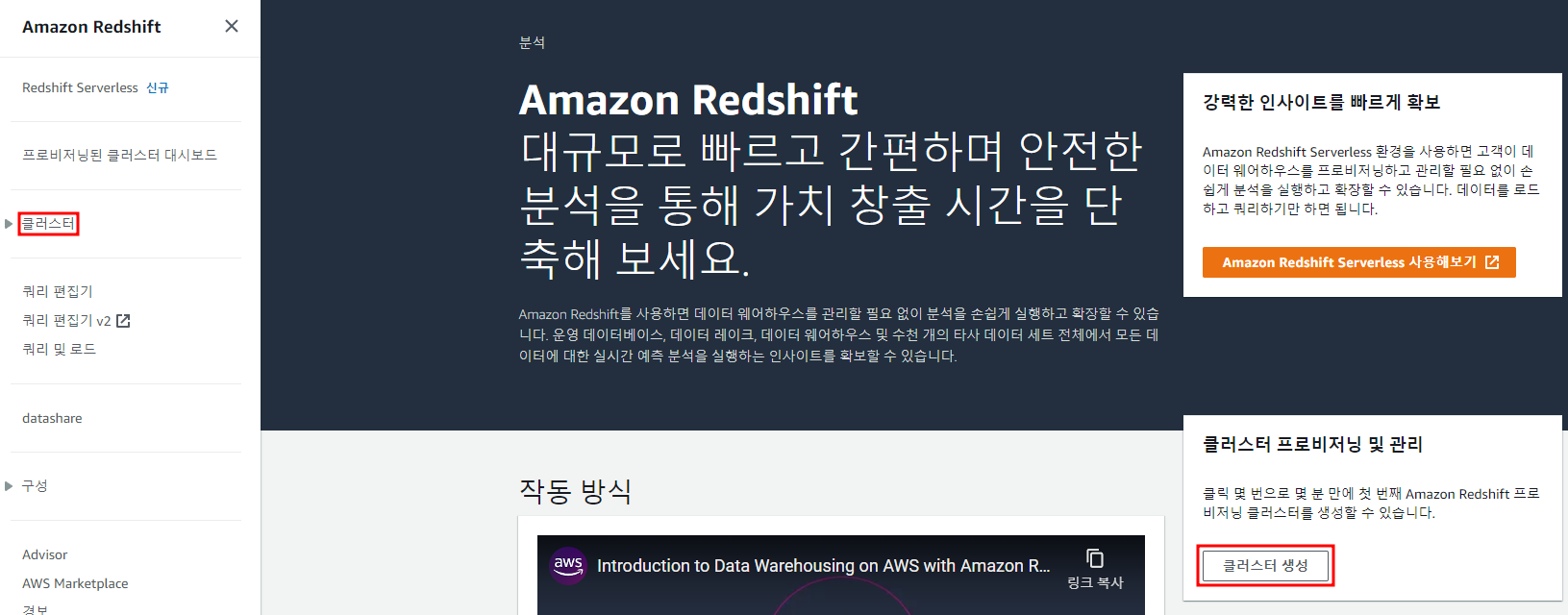 - Amazon Redshift 클러스터를 설정하고 S3 데이터를 Amazon Redshift로 로드