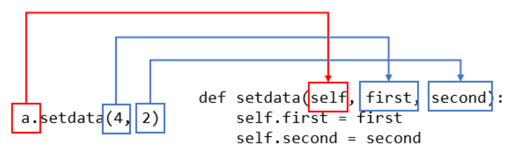 setdata 메소드에는 매개변수가 3개인데 왜 2개의 값만 전달할까? 그 이유는 a.setdata(4,2) 처럼 호출하면 setdata 메소드의 첫 번째 매개변수 self에는 setdata 메소드를 호출한 객체 a가 자동으로 전달되기 때문이다.