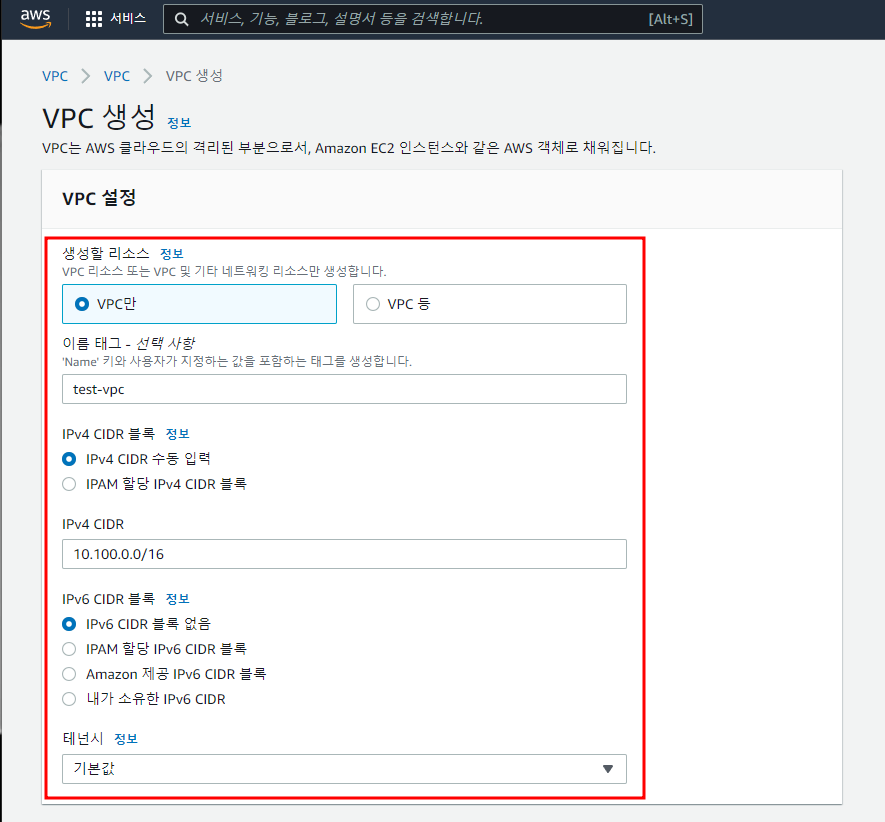 2) 생성할 VPC의 이름과 CIDR블록을 지정해준다.